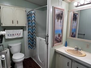 You are here: Sun Resales > 2 bedroom 2 bath, 55+ Community, Active 55+ Community, Active Adult Community, Doublewide, Gated Community, Great Central Florida location, Homes of Merit doublewide, Includes Golf Cart, Manufactured home, Mobile home, Offered Furnished, Swiss Golf & Tennis, Upscale Resort Community > Fully Furnished & Move-In Ready with Golf Cart Included! > 18 Master Bath